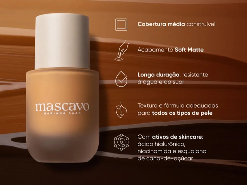 Uma maquiagem completa, aliada com ativos de skincare como ácido hialurônico, niacinamida e esqualano de cana-de-açúcar, que cuidam da pele enquanto uniformizam o tom.